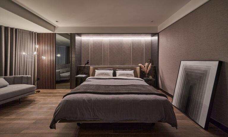 緩步移動至私領域,有別於公領域大量的石材應用,主臥室則以木質調為基底,以此營造寧謐安穩的休憩氛圍。另外,考量到該區域的格局並不方正、存在畸零空間,團隊便決定在床頭增設展示平台、臨窗處設置沙發。此舉不僅化解了不規則的結構問題,還能增加使用機能、提升空間坪效。