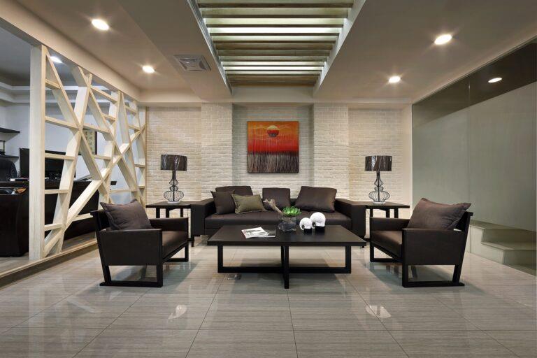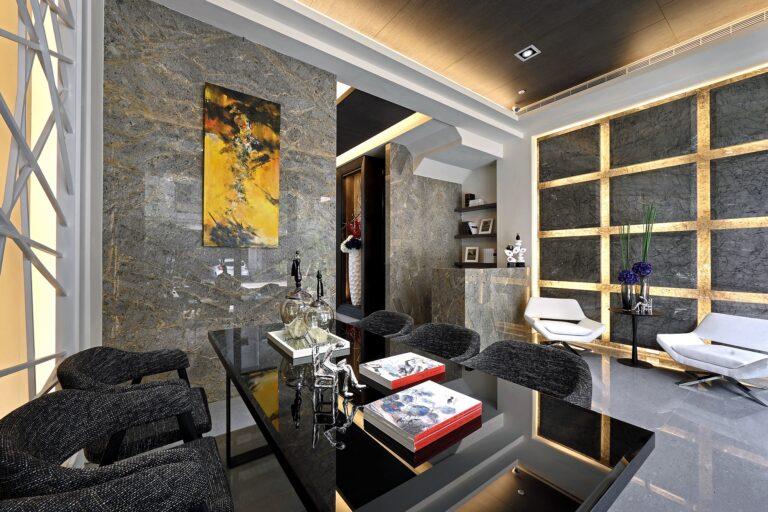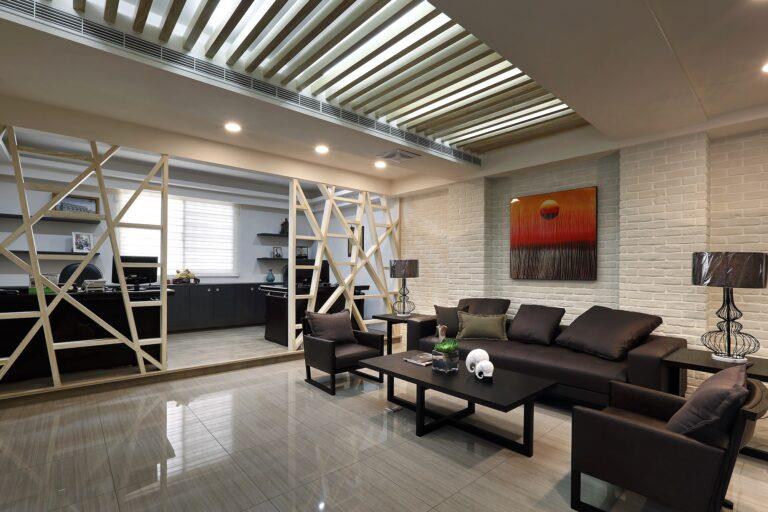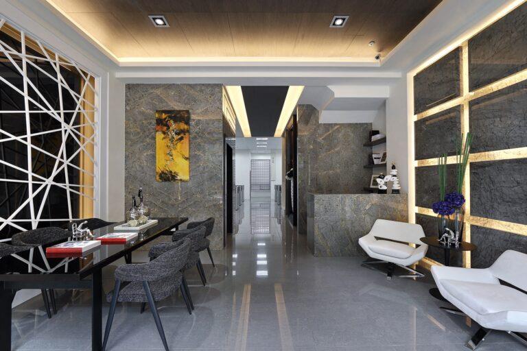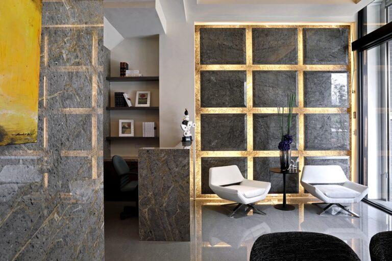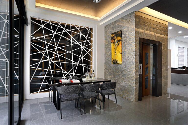 走進接待區,團隊特意選用銀河灰大理石作為端景牆、接待櫃檯與局部背牆的材料,其冷調的色彩、細膩的紋理搭配暖調的間接照明,可為場域營造出沉穩、高雅的氛圍。其中,接待區的兩面背牆分別以井然有序的塊體設計、交錯的線條元素來表現俯瞰建築、城市網路交織的意象。向內走至工作區,團隊選擇以白光作為此處的主要燈源,藉此創造明亮、舒適的辦公環境。另外,由於本案尤為重視機能區的獨立性,因此不論是諮詢區、多功能辦公區抑或是會談室,皆有規劃鏤空隔屏或實體牆,冀望以此讓員工沉浸工作、提升辦公效率。值得一提的是,在多功能辦公區的天花板上,團隊巧妙運用格柵結合燈具,使其產生如同自然光穿越天井格柵灑落而下的視覺效果。