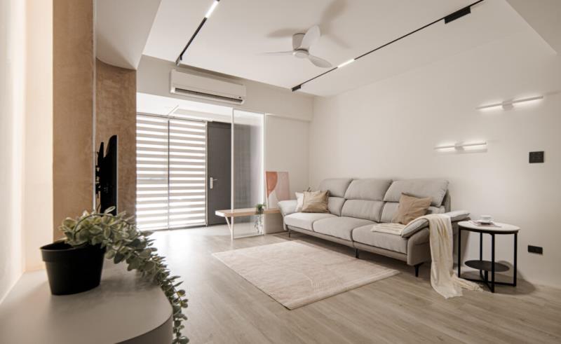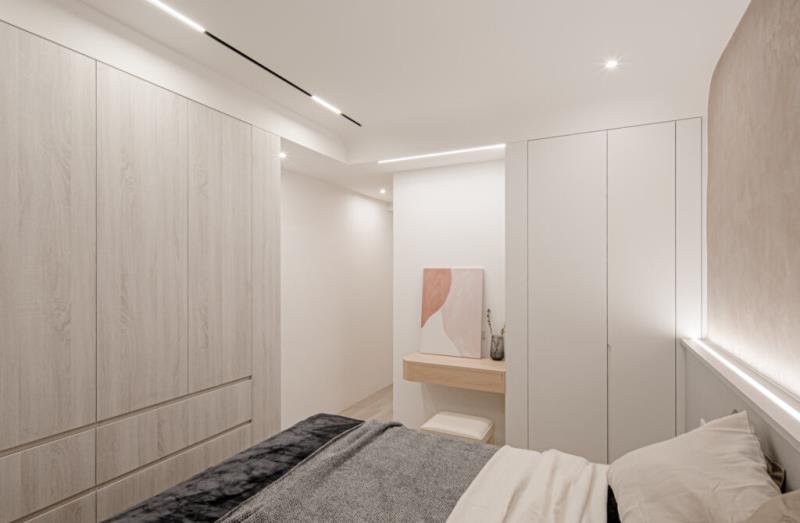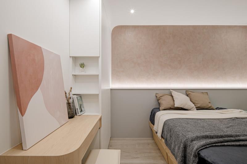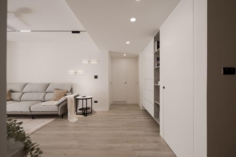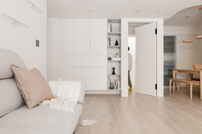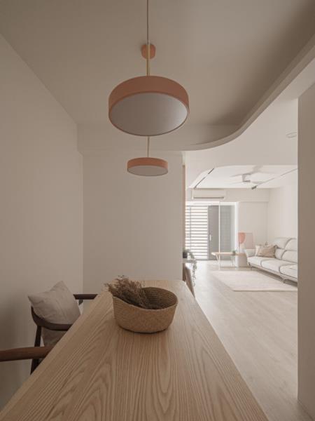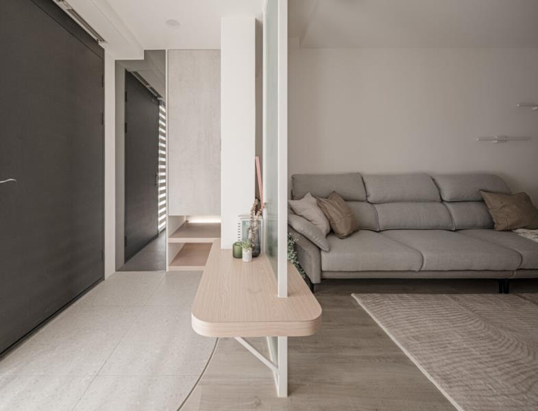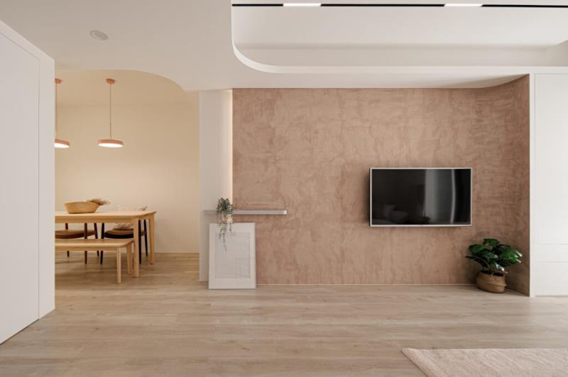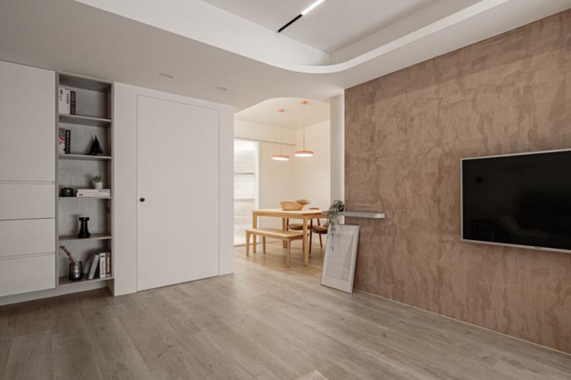 甫入落塵區,團隊於此裝設透光、不透視的長虹玻璃屏風作為界定,結合木作穿鞋椅,使其既能化解穿堂煞的風水疑慮,又能維持空間的通透度並兼顧實用性。其中,團隊亦善用材質別樣的地坪設計來劃分場域,可避免如傳統住宅門檻設計易造成絆倒受傷之情形。向內走去,公領域特意採開放式設計做整合。此舉不僅能增加場域使用的彈性、消弭樑體帶來的壓迫感、創造敞亮的空間感受,還能促進家庭成員的互動頻率。此外,本案有導入弧形曲面設計於部分立面和天花板,再搭配暖光和溫潤木質的應用,可為住所營造出溫馨浪漫的氛圍。通往至餐廚空間,餐廳與廚房之間設有長虹玻璃拉門,能有效解決烹調時油煙逸散之問題。緩步移動至私領域,臥室內設有諸多收納櫃以因應屋主的儲物需求。同時,櫃體是採無把手設計,能讓空間維持簡潔俐落的風貌,兼顧機能與美學。