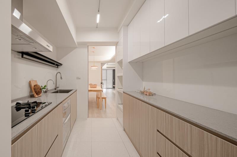 為了打造出健康、永續的宜居環境,此次設計有採用不少的環保手法與建材。首先,公、私領域皆有留設對外窗,再搭配開放式的公領域佈局,可大幅提升自然光的引入量,減少屋主白天使用人工照明的需求。同時,裝設省電LED燈,能有助於降低電力耗損,達到節能減碳的效果。接著,主建材是選用無毒、零甲醛的伊莉莎白(Elizabeth)木地板和低VOC的司曼特塗料,能有效減緩施工對人體、環境造成的負面影響,實現人本健康、生態永續的目標。