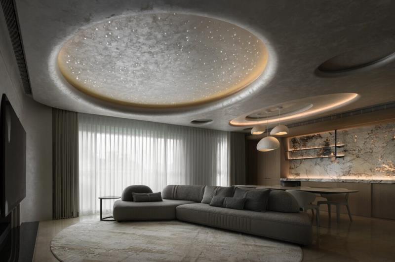 本案是以「月球」的形象作為設計主軸。透過圓弧元素、星空吊頂設計、灰色系藝術塗料與透光石材的應用,讓居者一到家便如同進入寂靜的月世界,藉此拋開繁雜的思緒與疲憊的身心。除了打造引人入勝的空間風貌,該案也十分注重美學與機能的結合,其中便包括採用弧形收邊設計來包覆空調機台。