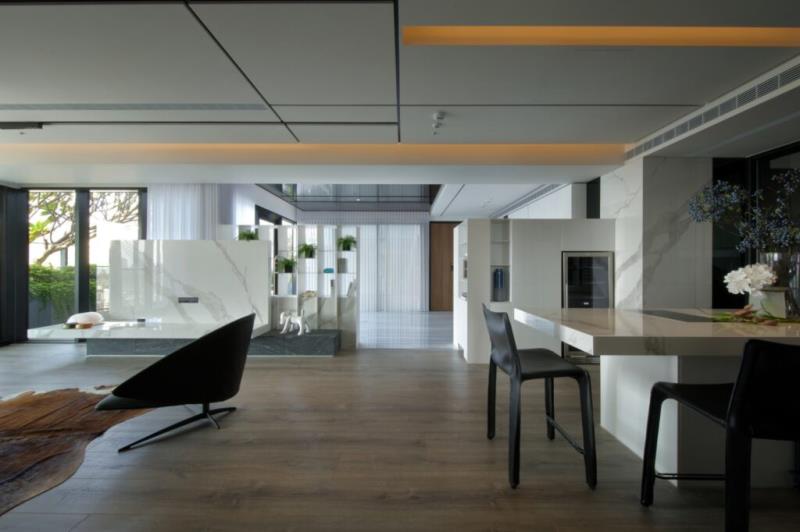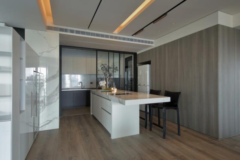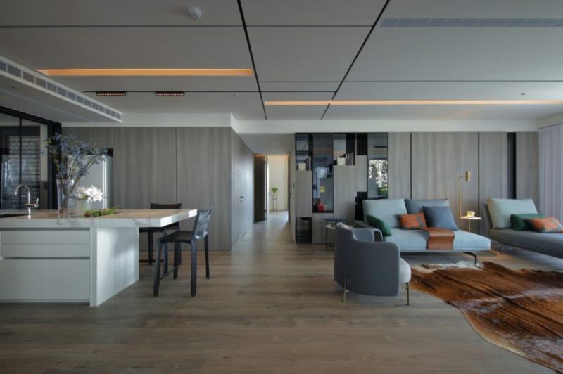 一入室,設計師改變原先落塵區和餐廳的場域設定,利用空間留白的狀態將自然光景引進屋內,為居所挹注清新綠意與流動氣韻,形塑張弛有度的空間感受。此外,留白的區域亦可因應日後的使用需求隨時增添傢俱。向內走去,設計師將客廳與餐廚空間規劃於同一軸線,讓採光效果發揮至最大化。而廚房設有玻璃拉門,可維持場域通透度,並防止烹調時油煙逸散。其中,中島配置可作為備餐台、吧台及輕食區等功能,大幅提升了空間坪效。