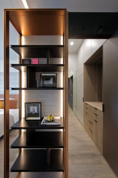 緩步移動至主臥室,設計師將更衣間規劃於床榻區前,以此為居者預留緩衝空間,增加場域的隱密性。而更衣間末端設有鏡面,不僅能作為儀容鏡,還能開闊視覺的廣度,化解原先侷促的空間感受。另外,設計師特意將其中一間次臥延續留白概念。既可在現階段作為書房功能,亦可在日後轉回臥室用途,以應對居者不同人生階段的使用需求。其中,牆面是以手繪技法繪製而成的海邊意象,能為空間渲染上一抹愜意祥和的氛圍,撫平居者疲憊、繁雜的思緒。