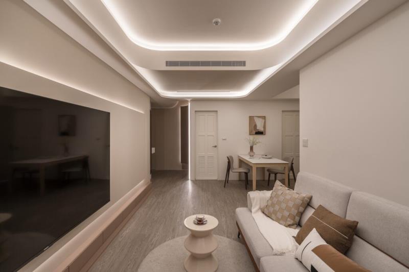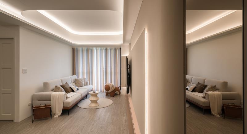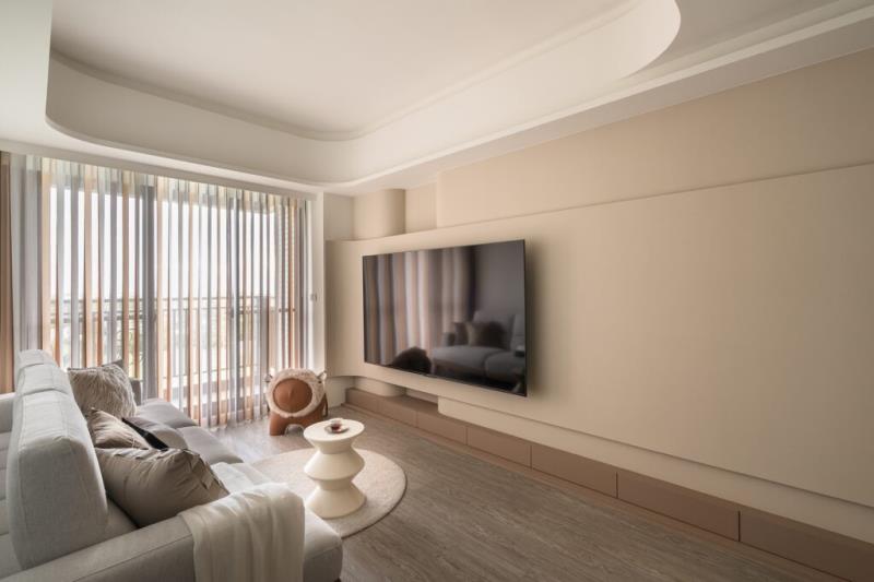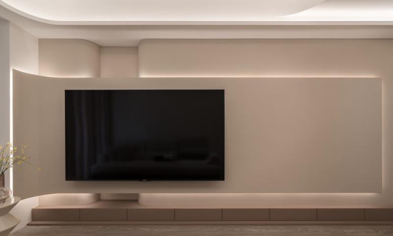 置身於客廳,作為本次亮點設計之一的電視主牆,是由精細的木工打造而成的兩層式弧形壁板。先以25公分深的壁板為底,再加上一塊輕薄壁板,並搭配加固措施,使其懸掛大尺寸電視也能安全、穩固。其中,於背板導入LED燈帶,並在圓弧凹陷處刻意斷光,讓光影層次更加豐富。此外,下方電視櫃特意僅做15公分的高度,以此兼顧美觀與收納機能。