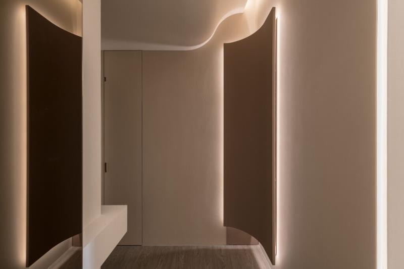 甫入玄關,映入眼簾的是結合圓弧造型壁板的隱藏式滑軌收納櫃設計,既能滿足屋主的儲物需求,又能達到入室動線引導的作用。此外,團隊亦有沿著動線在右側牆面增設L型層板和圓弧茶鏡。L型層板可提供鑰匙或其他小型物件放置的平台;圓弧茶鏡則能隱匿後方電錶箱,並作為儀容鏡使用。