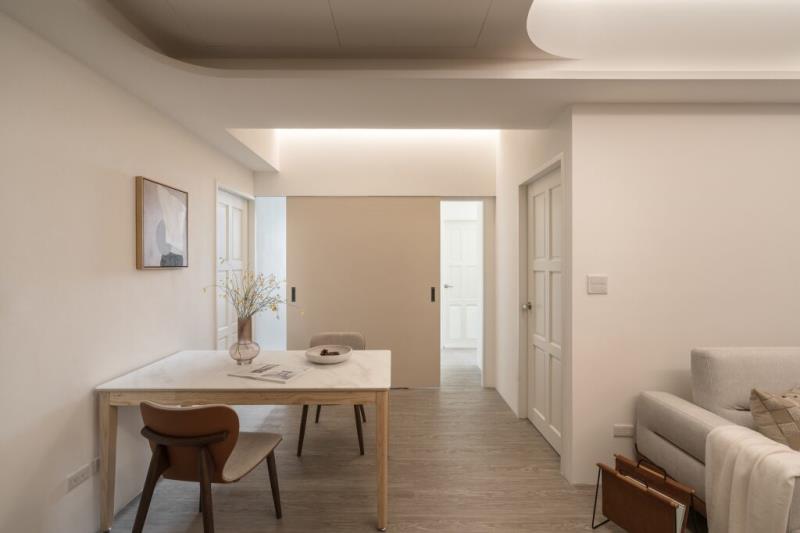 透過「圓弧修飾量體」、「隱藏式收納機能」和「無銳角的安全設計」,營造舒適和諧的生活場景。此外,本次規劃有考量到孩童的成長及未來的需求變化,特意採取留白設計,以便日後增設機能設施,藉此為一家三口提供彈性、多元且永續的居住環境。