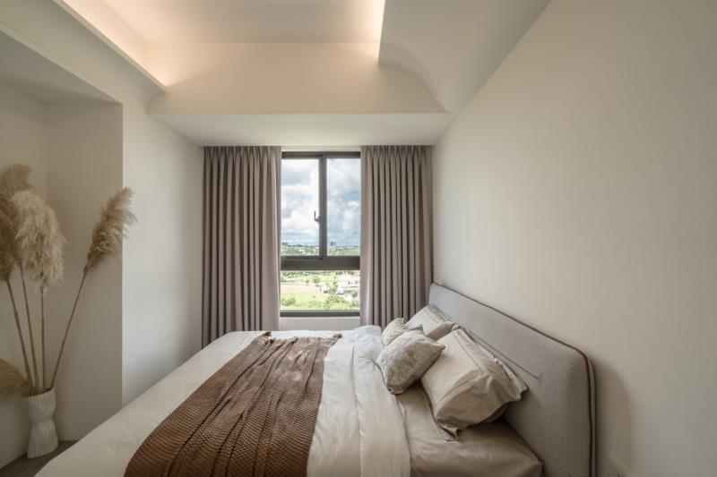 緩步移動至私領域,團隊在主臥和遊戲室的天花板皆有運用S型圓弧設計修飾樑體。此舉不僅能呼應空間主題,還能避免屋主因大樑感到壓抑或不適。通往至遊戲室,團隊特地不做過多綴飾和佈景,以滿足孩子當前的使用需求,及日後增設傢俱時所需的擺放空間,讓住所功能不受限。