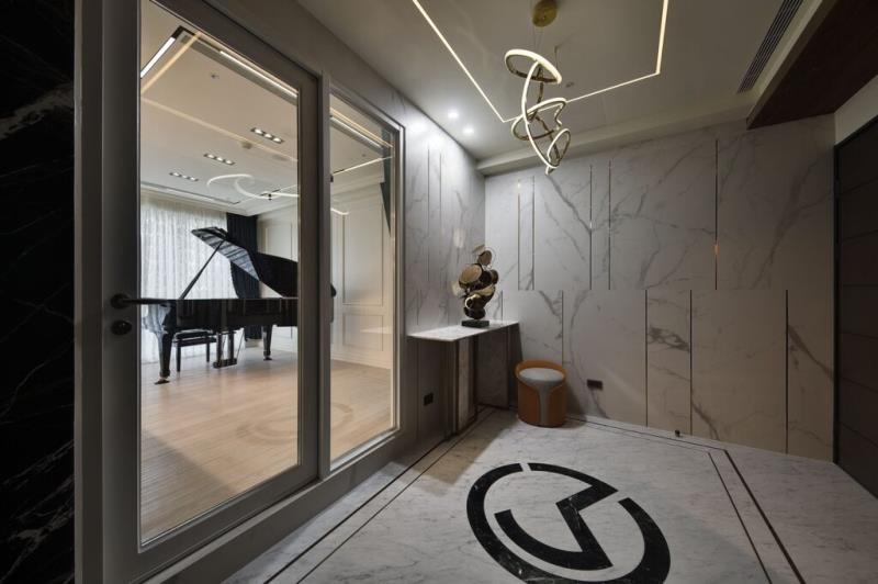 玄關牆面以大理石與鍍鈦金屬的分割設計,創造宛若黑白琴鍵的意象,呼應屋主的音樂愛好。琴房採用外中內三層的隔音建材,確保在演奏時不會影響鄰里,同時提供卓越的音質效果。高級隔音門與四面窗簾的搭配,更進一步提升了空間的實用性與私密性。琴房與客廳之間設置了一道活動拉門,讓公私領域的區分更加靈活,使空間的使用方式充滿彈性。