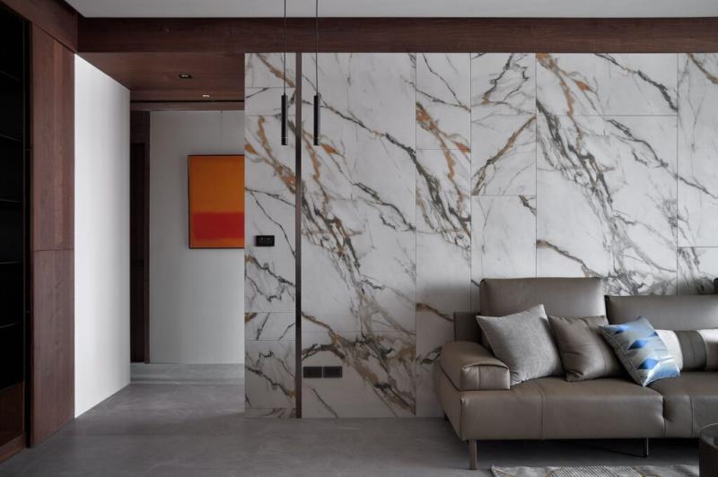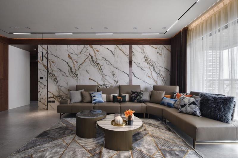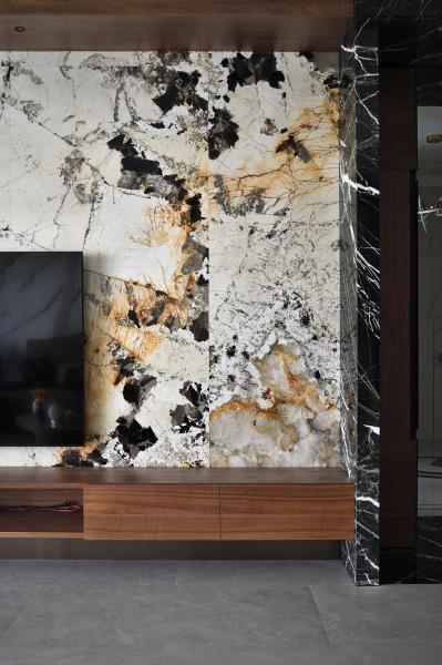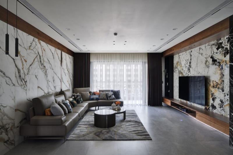 由於屋主期望客廳呈現沉穩、書香的氣質,設計師精心挑選了溫潤的石材、木皮等天然建材,打造人文藝術的質感空間。電視牆採用紋理自然的大理石,與沙發背牆的設計呼應,發揮相得益彰的效果。燈光部分選用磁吸式軌道燈,除了線條簡潔、光線柔和之外,還具備便於安裝與拆卸的優點,能依據居者使用需求靈活調整。