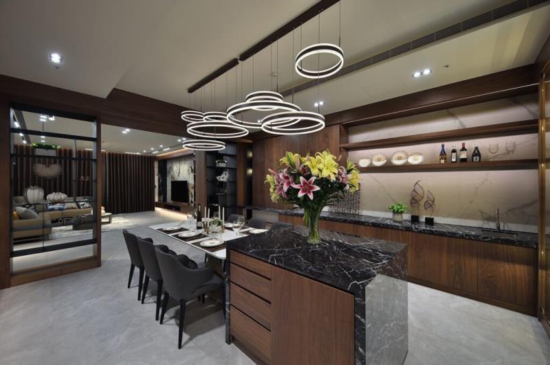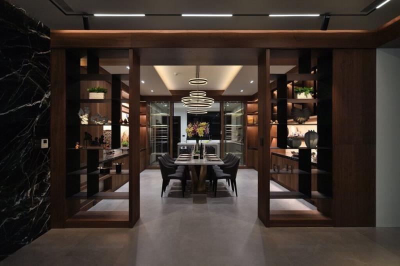 餐廳利用懸吊的鐵件書櫃與客廳作出區隔,既能保持場域的通透性,又巧妙地發揮展示藏書的功能,形成一幅充滿書香氛圍的和諧畫面。餐廳另一側以不鏽鋼展示酒櫃與廚房劃分。酒櫃運用玻璃門片、層板與背板,結合具反射特性的不鏽鋼,創造輕巧而具穿透力的展示效果,使餐廳雖然被櫃體圍繞,卻依然保持明亮與開放感。餐廳中央設有中島餐桌,搭配高低錯落的造型燈具,打造別緻迷人的用餐環境。廚房規劃的電動門,不僅有效地隔絕油煙,也讓屋主在端料理的過程更為便捷。