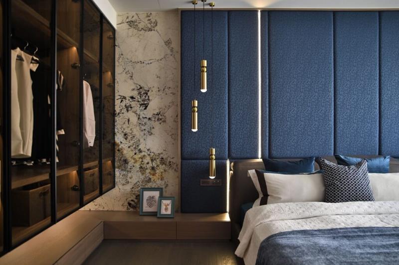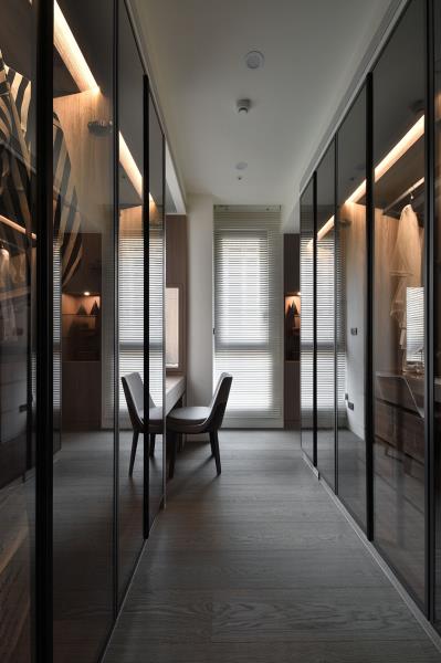 主臥室以屋主喜愛的藍色為主題,床背牆選用普魯士藍繃布,搭配鋼條燈的分割,呈現鋼琴琴鍵的意象,巧妙地營造出層次感。為了滿足屋主的收納需求,規劃了可展示衣物與包包的玻璃櫃體,既實用又美觀。於更衣室入口處配置黑鏡隱藏門與全身鏡,加上兩側櫃體的玻璃門片,讓整體視覺更加開闊、通透和明亮。