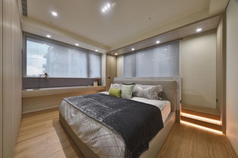次臥房採用半高的床頭牆設計,不僅保留了良好的自然採光,也化解床頭壓樑與靠窗的風水問題,同時,牆面後方的空間還能提供收納功能。臥榻區的階梯處設置了燈條,晚間可作為小夜燈使用,增添居住的安全性。