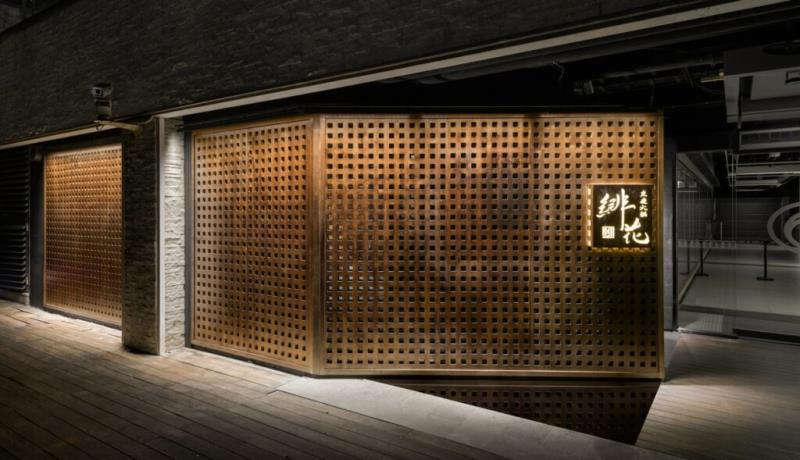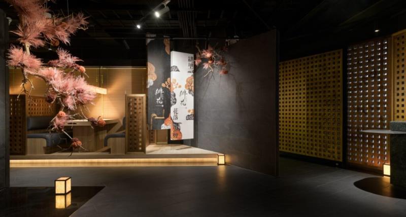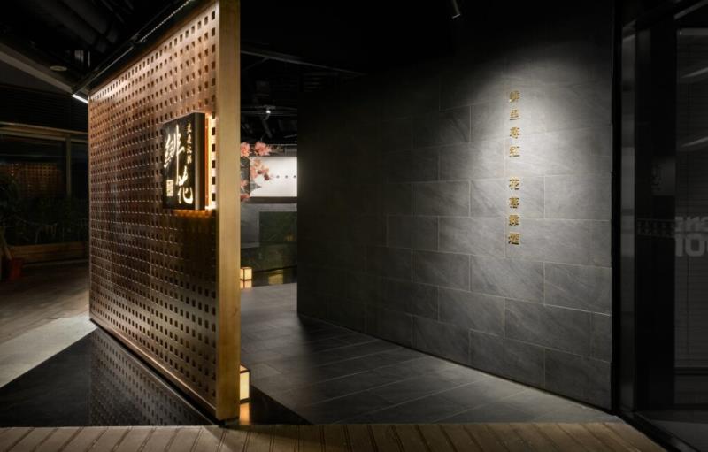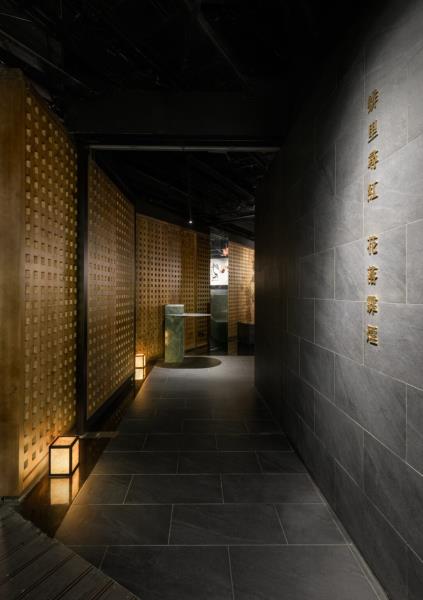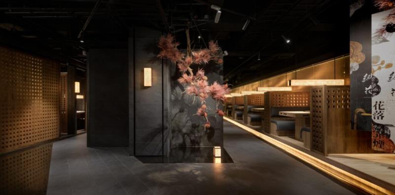 佇立於店外,入口廊道象徵城橋,引領著顧客走進店內。而鄰接於廊道一側的黑色亮面EPOXY地板,則藉由反光的特性表現出江面河水波光粼粼的意象。沿著L型動線向內走去,昏暗的燈光使人的心靈得以沉澱,並深陷重慶古都的幻境。進到接待區,團隊於此採取動線分流設計,以代表緋花的紅花枝條為界,分別將獨立式包廂和半開放式座位區劃分左、右。此舉不僅讓顧客在行走時更加直覺,也能避免顧客與友人交談時受到干擾。在包廂的配置上,為實現業主對商務包廂需容納30人的需求,及應對日常營業的實際情況,團隊特地在大包廂採用了萬向軌道設計,讓場域劃分能依當下的需求靈活調整,提高空間使用彈性。