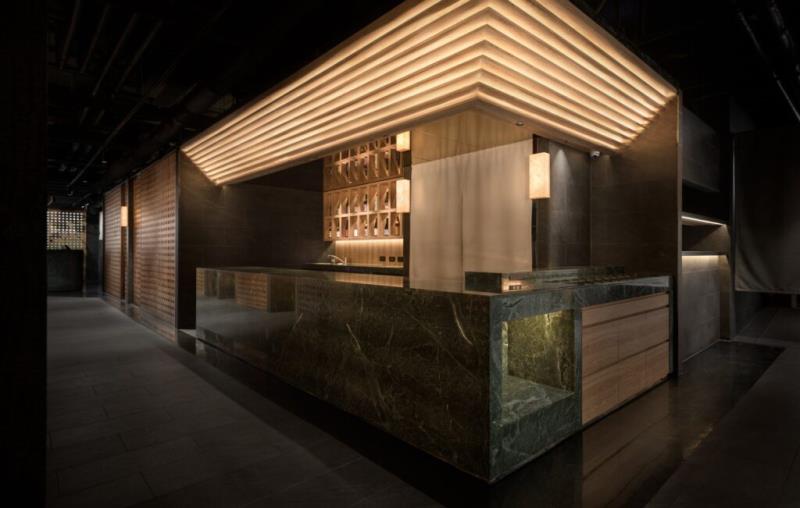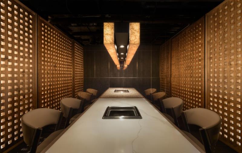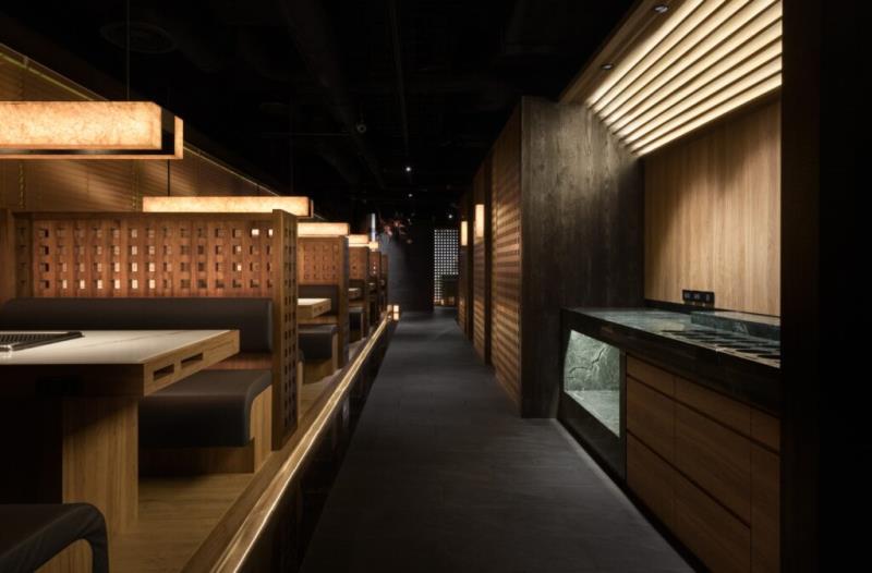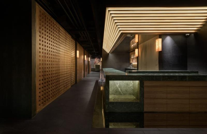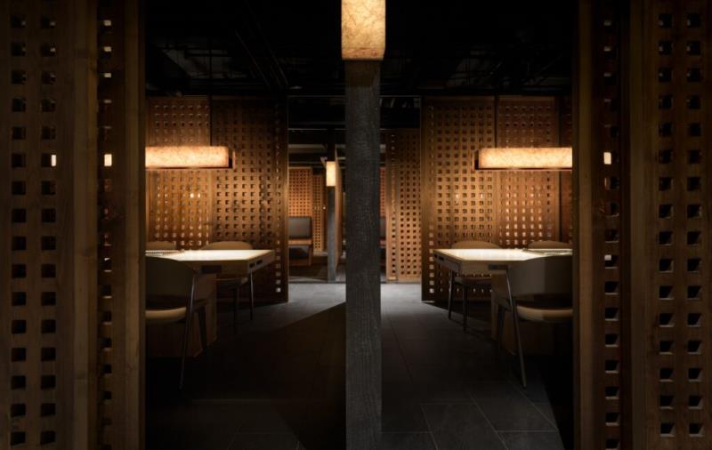 在用餐區的氛圍塑造上,團隊巧妙以昏暗的空間、板材的應用和燈飾的點綴來營造古城的夜色之美。首先,從入口到用餐區所採用的鏤空木隔板,在提供顧客隱私之餘,亦能達到透光效果,展現古城中萬家燈火的市景意象。其中,木隔板的小洞是經由CNC(Computer Numerical Control)切割而成,精準又高效。接著,為突顯新中式美學,本案的照明計畫除了常見的軌道燈和燈條之外,團隊還有以透光石為發想訂製出獨特燈飾。其是由宣紙玻璃和壓克力組構而成,可隨燈光投射呈現出自然紋理。既符合業主的預算考量,又滿足了美感要求。另外,料理台上方有導入中式建築經典的斜上漸層屋簷設計,再搭配間接照明的綴飾,能更加彰顯東方雅緻的韻味。