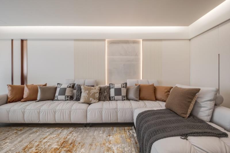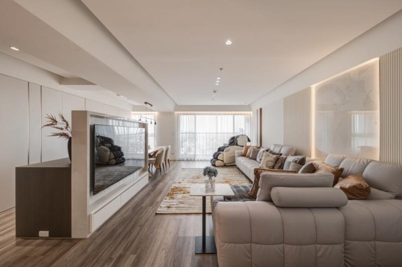 全案以開放佈局串連生活動線,透過材質轉換與光感層疊,梳理日常節奏與空間韻律。設計自細節著眼,運用天然肌理、柔光滲透與簡約語彙,彷若枝葉呢喃、晨光穿林,情感舒展其間,將細瑣與柔情一寸寸織入場域深處,悄然勾勒出家的溫度與形狀。