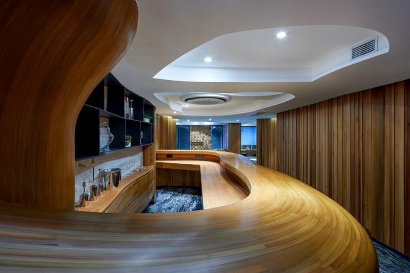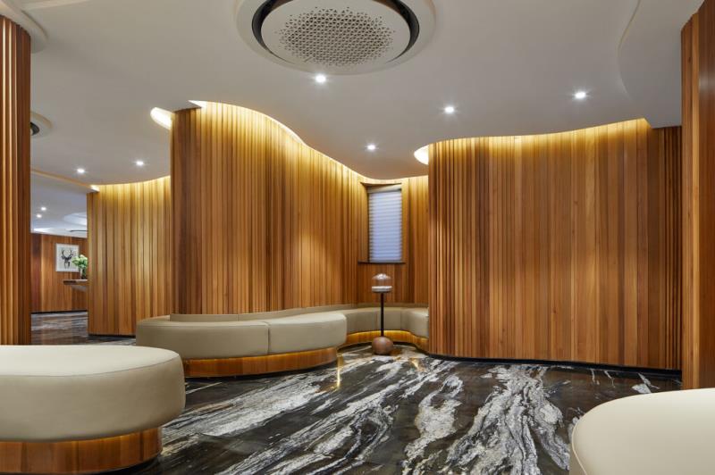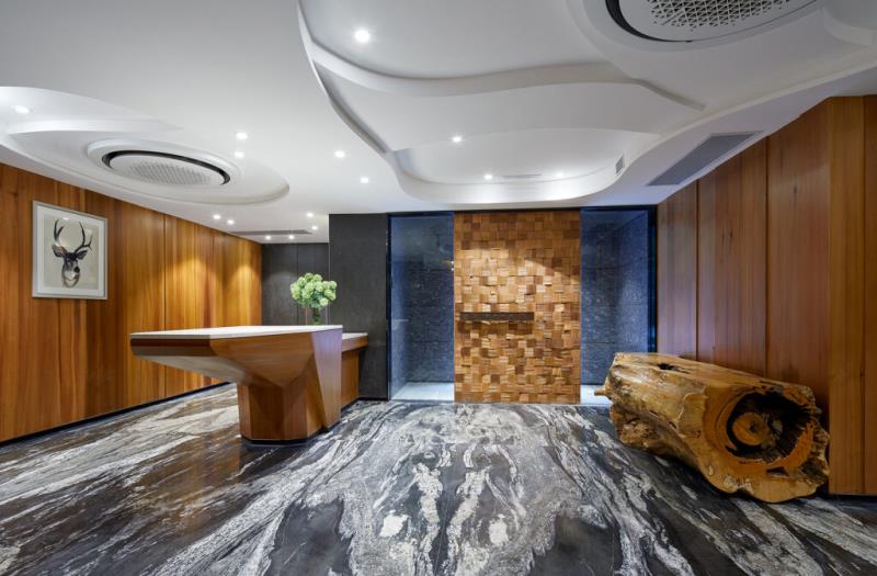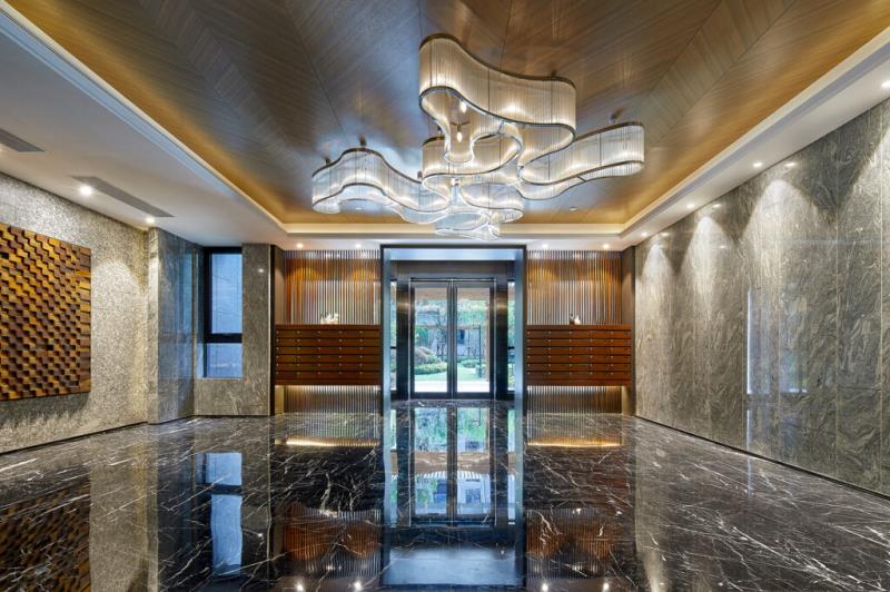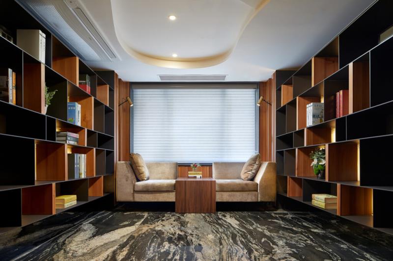 大廳以當地自然環境作為設計核心,透過大量的木質調與石材地面鋪陳空間,搭配雲朵造型燈飾作點綴,營造出自然的大地氛圍,舒緩居住者勞累的身心靈。有別於傳統的方正格局,本案廣泛運用圓弧造型與曲線條,讓居者仿若置身蜿蜒的樹洞一般,體驗寧靜、和諧的獨特感受。吧台區以有機線條的木材所打造,除了能讓住戶於喧囂城市中暫時放鬆休憩,也提供一處交流互動、維繫感情的區域。交誼場域中的座位沿著牆面設置,不僅呈現富含變化的趣味性,亦維持了走道空間的開闊。閱讀室延續自然的大地風格,配上溫暖柔和的燈光,創造出溫馨、愜意的靜態場所,帶來使人沉澱心靈的藝術人文氣息。