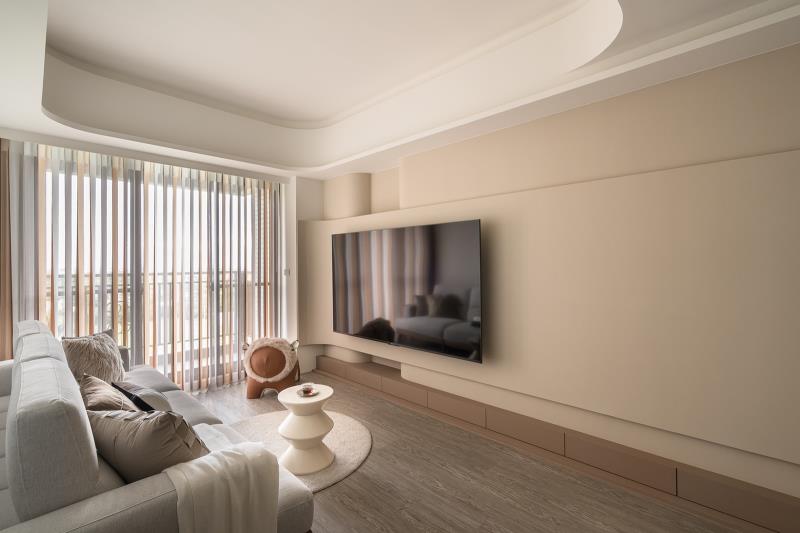 進入公領域,空間中的樑柱均採圓弧收邊設計,再搭配局部的間接照明,除了能消弭低樑、柱體產生的壓迫感,維持場域中央挑高的尺度之外,還能避免家中孩童奔跑、玩耍時磕碰受傷的安全疑慮。另外,團隊是採開放式設計整合客廳與餐廳,能讓映射入室的自然光毫無阻礙地流淌於全室,解決內部空間昏暗之問題。置身於客廳,作為本次亮點設計之一的電視主牆,是由精細的木工打造而成的兩層式弧形壁板。先以25公分深的壁板為底,再加上一塊輕薄壁板,並搭配加固措施,使其懸掛大尺寸電視也能安全、穩固。其中,於背板導入LED燈帶,並在圓弧凹陷處刻意斷光,讓光影層次更加豐富。此外,下方電視櫃特意僅做15公分的高度,以此兼顧美觀與收納機能。