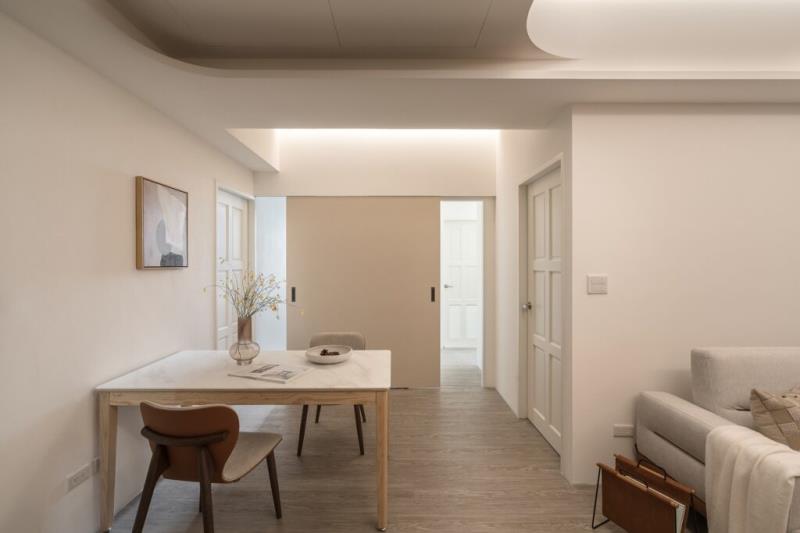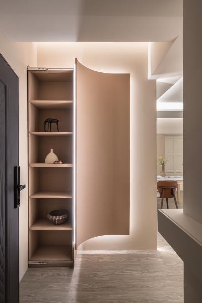 甫入玄關,映入眼簾的是結合圓弧造型壁板的隱藏式滑軌收納櫃設計,既能滿足屋主的儲物需求,又能達到入室動線引導的作用。此外,團隊亦有沿著動線在右側牆面增設L型層板和圓弧茶鏡。L型層板可提供鑰匙或其他小型物件放置的平台;圓弧茶鏡則能隱匿後方電錶箱,並作為儀容鏡使用。