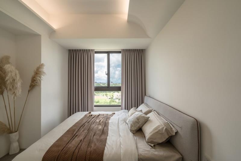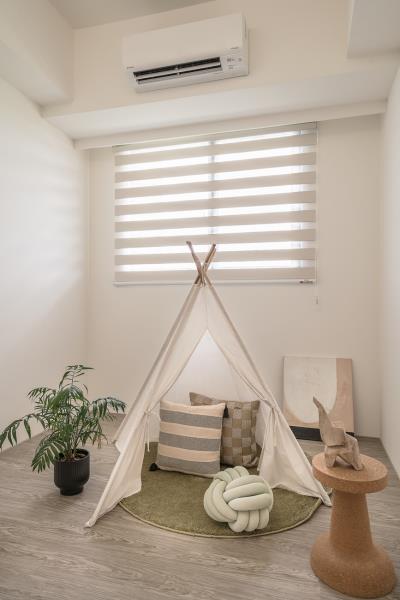 緩步移動至私領域,團隊在主臥和遊戲室的天花板皆有運用S型圓弧設計修飾樑體。此舉不僅能呼應空間主題,還能避免屋主因大樑感到壓抑或不適。通往至遊戲室,團隊特地不做過多綴飾和佈景,以滿足孩子當前的使用需求,及日後增設傢俱時所需的擺放空間,讓住所功能不受限。
