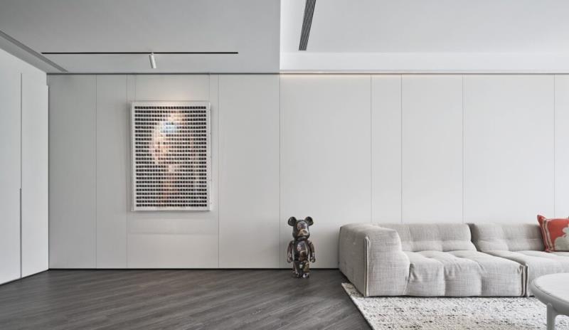 整體先以低飽和的色彩作為空間基底,再利用石材、木料、灰玻的材質肌理和造型燈具點綴空間,以此為簡單純粹的居所增添細膩層次。另外,客廳是採無主燈設計,其光源計畫主要是利用落地窗引進的自然光,搭配局部的崁燈與線性照明,不僅能賦予居者輕盈、具流動性的空間感受,還能增加空間的敞亮感。