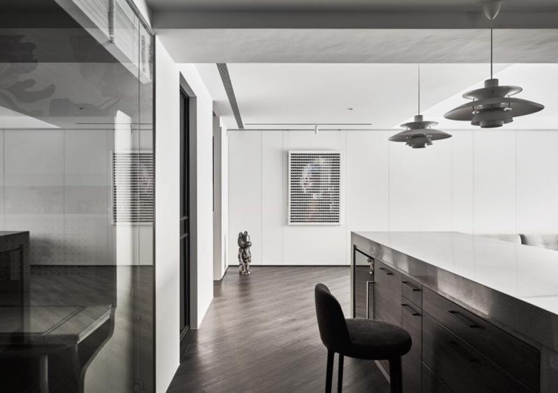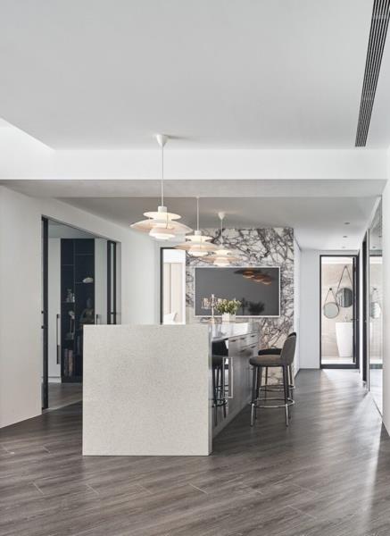 本案透過「以人為本」的觀點切入設計,在空間結構、佈局和機能配置上皆依循居者的生活軌跡進行擘劃。從合宜的格局、動線與開窗安排,再到契合居者需求的機能設計,皆是為了給予居者最佳的生活體驗。其中,開放式餐廳內的餐桌,即是以可伸縮的中島桌檯去因應親朋好友來訪時所需的用餐空間。本案跳脫一般豪宅多以繁瑣的綴飾彰顯精緻奢華的特性,此次特地採用「減法設計」進行擘劃。先以現代簡約底定空間風貌,再利用造型燈具、質感傢俱與材質紋理注入細節巧思,讓看似簡單的空間也能蘊含豐富層次,藉此重新詮釋豪宅的定義。