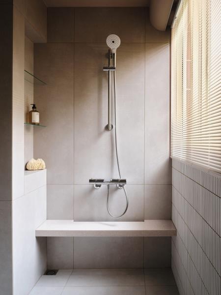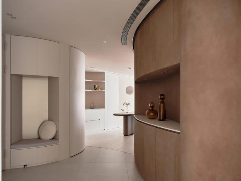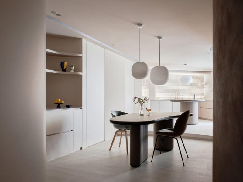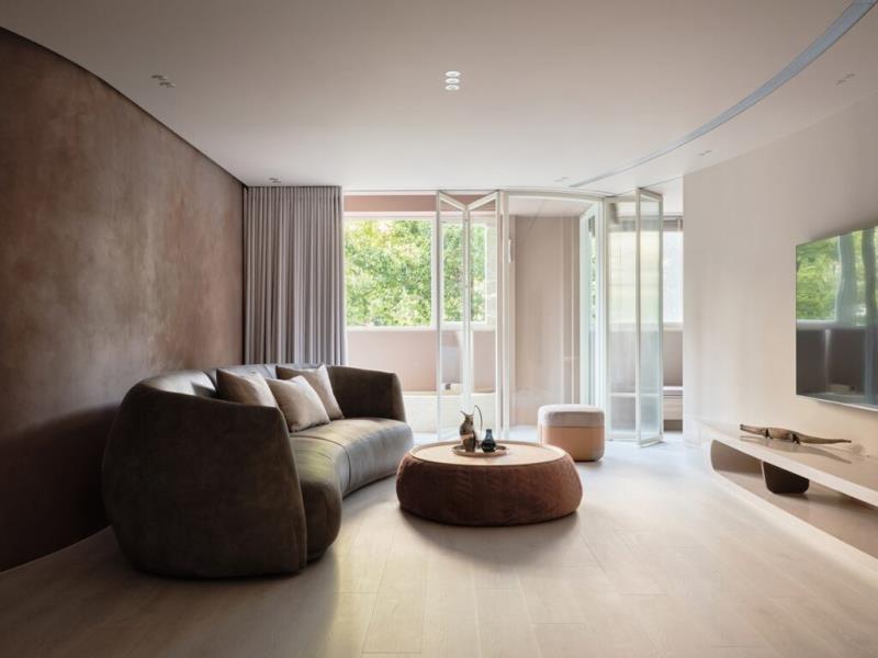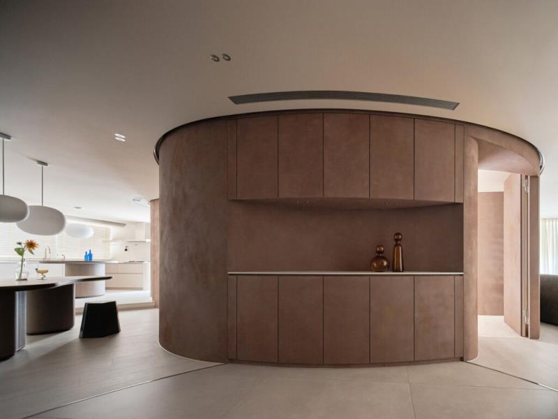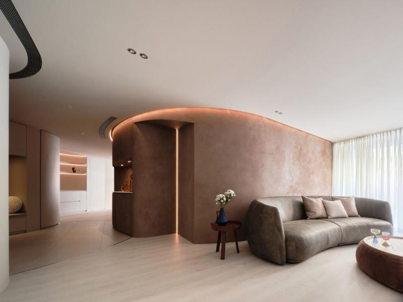 甫入室內,整體空間以溫潤的大地色系鋪陳,搭配廣泛運用曲線條與圓弧造型,塑造舒適、柔美的氛圍。有別於一般住宅方正的格局,本案運用弧形的牆面劃分場域,讓公領域呈現C字型,藉此流暢的引導生活動線。為了迎合屋主的使用需求,為其量身定制多樣化的收納櫃,提供充足且靈活的儲物機能。而全屋皆採用無把手的櫃體,加上家具、牆角的倒圓設計,能減少碰撞受傷的機率,提升居住的安全性。客廳通往陽台的窗戶選用折疊窗,比起一般窗戶可以擴大開啟的空間,為室內帶來良好的採光與通風效果。此外,當居者需要於陽台晾曬衣物時,也能有更開闊的活動場域,方便搬運衣物進出空間。