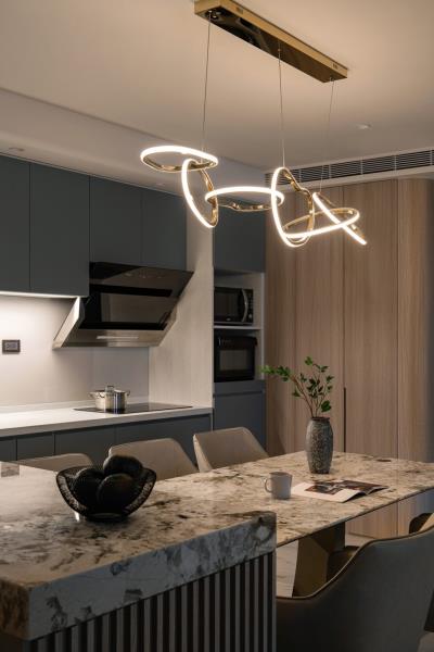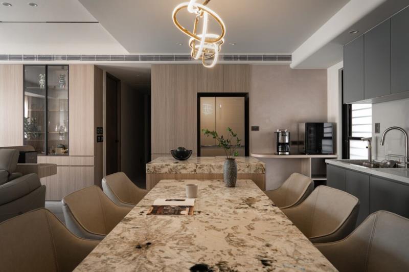 在美感之外,設計團隊同樣注重永續價值。全室櫥櫃採用符合F1等級的低甲醛板材,材料選用皆符合綠建材標準,降低對環境與人體的負擔。同時以高耐久性的大理石紋地磚與木質元素,兼顧使用壽命與舒適性。大面落地窗與開放式格局,則讓空氣與光線得以自然流通。本案將人本關懷、永續思維與美學融入日常,為居住者打造一處健康且永續的生活場域。