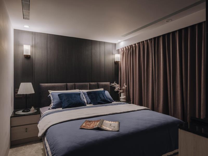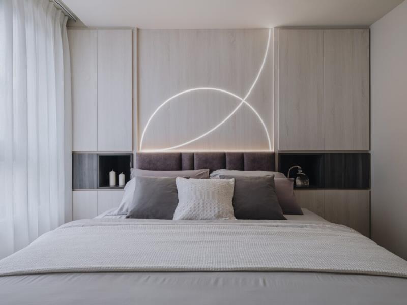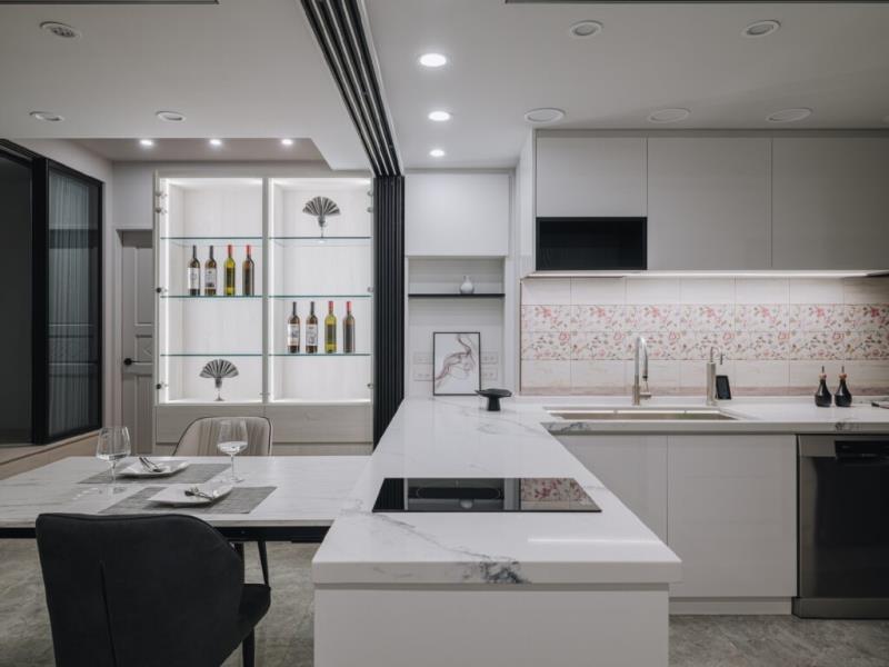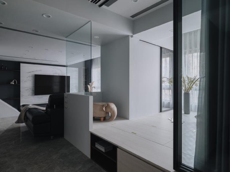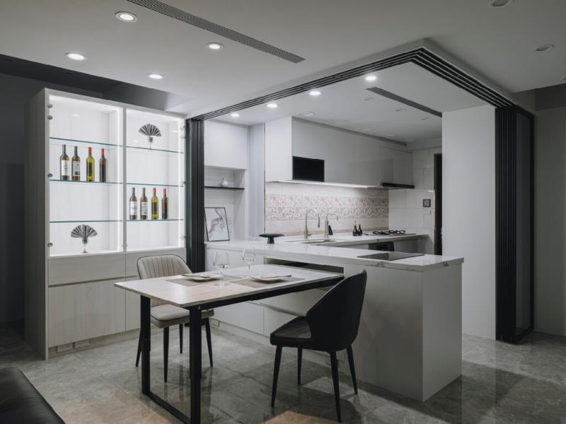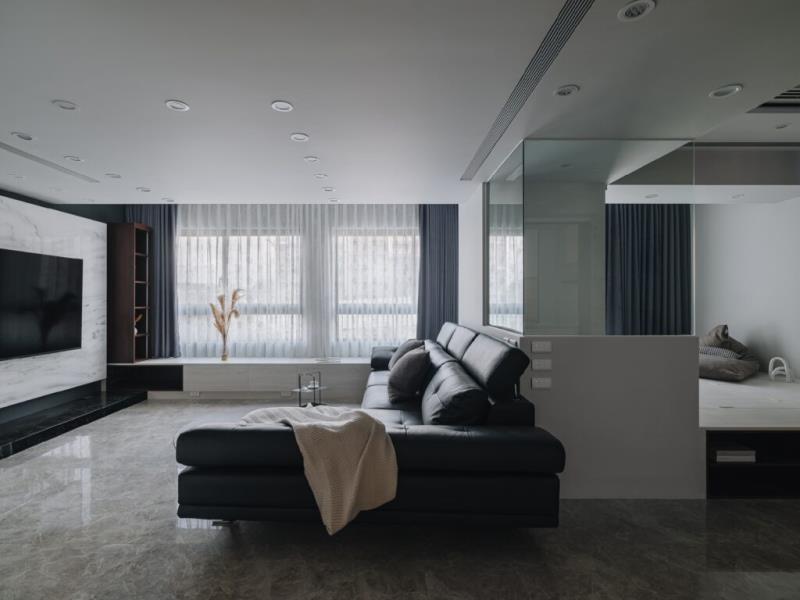 甫入室內,整體空間採用灰階色調鋪陳,營造出柔和、溫馨的氛圍。客廳天花板的大樑使用圓弧邊角手法,修飾了銳利的直線條,弱化大樑的空間壓迫感。設計師選用整面式的隔音氣密窗,可隔絕百分之九十的噪音,為居者帶來靜謐的生活場域。餐廚區運用玻璃推拉門與客廳作出劃分,除了保持良好的通透性之外,也能有效阻擋油煙。有鑒於本案室內空間有限、家庭人數不多、經常外食的情況,設計師特別選擇了隱藏式餐桌,平時可將餐桌收納於抽屜之中,待有需求時再開啟即可。和室與客廳之間採用通透的玻璃作區隔,規劃為兒童遊戲室或當作客房使用。為了確保年長者或孩童拿取物品時的安全性,和室摒棄了傳統的天花板收納,改將儲物機能設於地板下方,不僅降低磕碰受傷的危險,亦提供大量的置物空間。此外,本案還配有全屋吊隱式冷氣機與除濕機,藉由幾乎靜音的運轉、融入裝潢的設計,在帶來清新、涼爽空氣的同時,亦維持寧靜又美觀的室內環境。而除溼功能的設置,還能增加後陽臺晾曬衣物的效率,避免衣物發霉、無法晾乾的情形發生。
