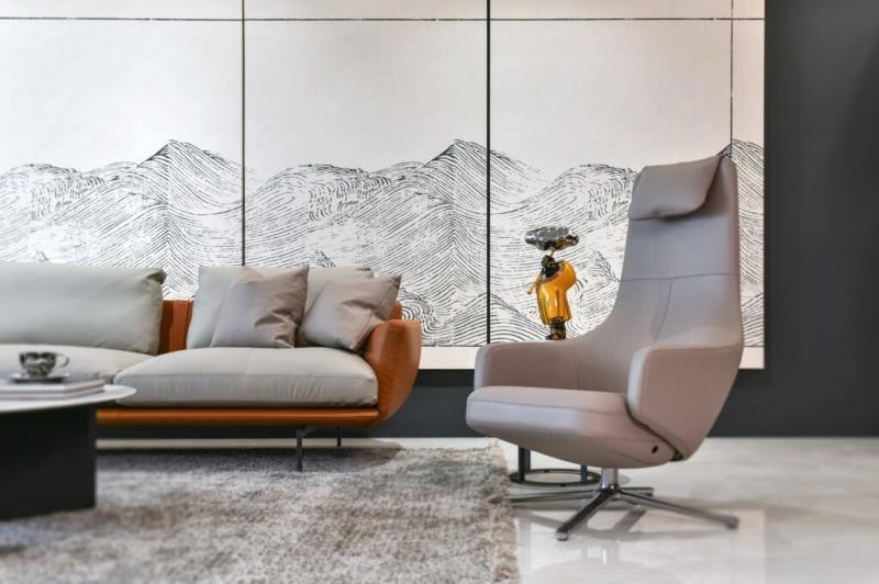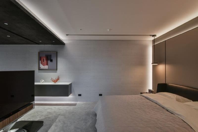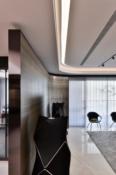為創造寧靜中又蘊含動感的空間型態,設計師將斐波那契序列(Fibonacci sequence)的黃金比例概念融入到本案的空間佈局中。從客廳天花板的弧形收邊處理、電視牆的曲面設計、波浪圖樣的沙發背牆到圓弧形傢俱配置等,既能消弭空間冷硬感,又能形塑出流動的視覺效果。色彩計畫則選用內斂的中性色為主,再搭配細膩的材質紋理,為空間挹注靜謐之感。