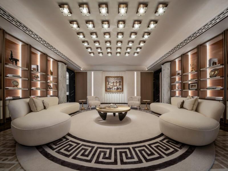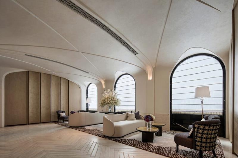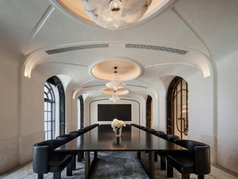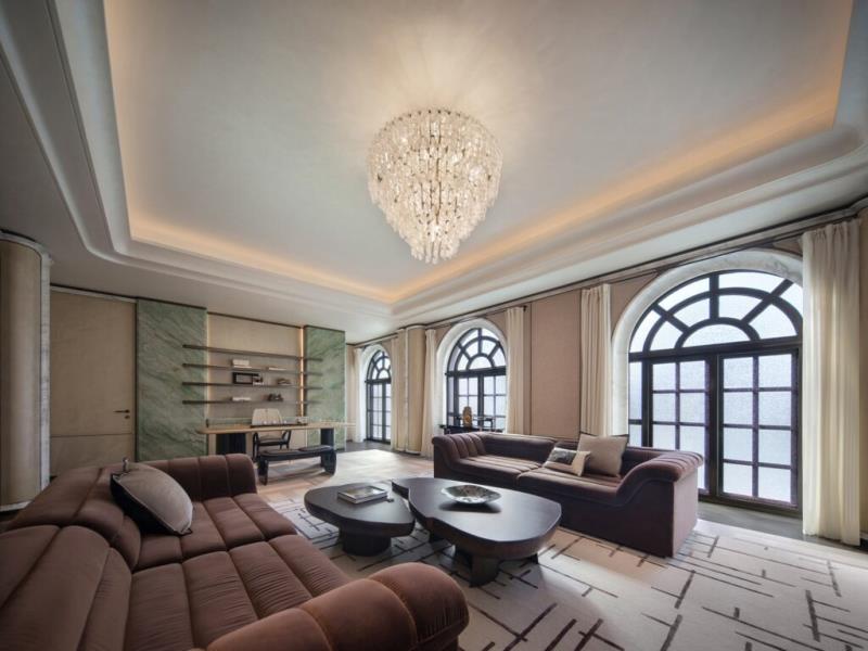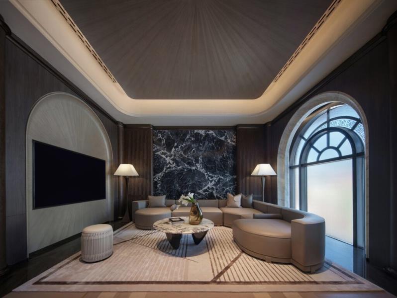 設計以ART DECO風格的石材拼花構築層次,開展一齣關於比例與光影的環境歌劇。一樓接待前廳與大堂藉米白石材鋪陳肌理,金屬飾條與懸垂水晶燈細織其間,描繪其莊麗恢宏氣勢。立面以對稱手法為筆,結合金屬構件與石面相互輝映,視線依循弧形階梯蜿蜒而升,使曲線與水晶光澤交織成畫。同時,天花融入LOGO圖紋,將品牌精神化幻化為空間語彙。地坪採取面包石鋪敘,其立體紋理道出洋行與商號的歷史印跡;電梯廳設計復古樓層指示燈,於細節間點亮文化溫度。