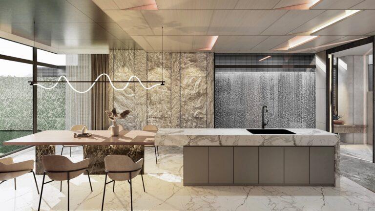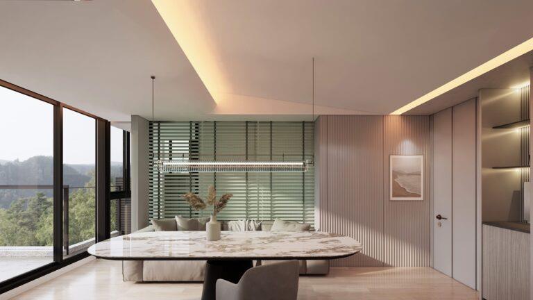 整體設計兼顧美感與功能,同時融入環保永續的理念。設計師選用了取自自然的石材與木材,減少了建築廢棄物的產生,且使用耐用性優越的材料,降低了日後維護與更換的需求,避免資源浪費。大量落地窗的設置,不僅引入了自然光線與新鮮空氣,減少對人工照明與空調的依賴,還提升了室內的空氣品質,為居住者提供了一個健康、舒適且永續的居住環境。