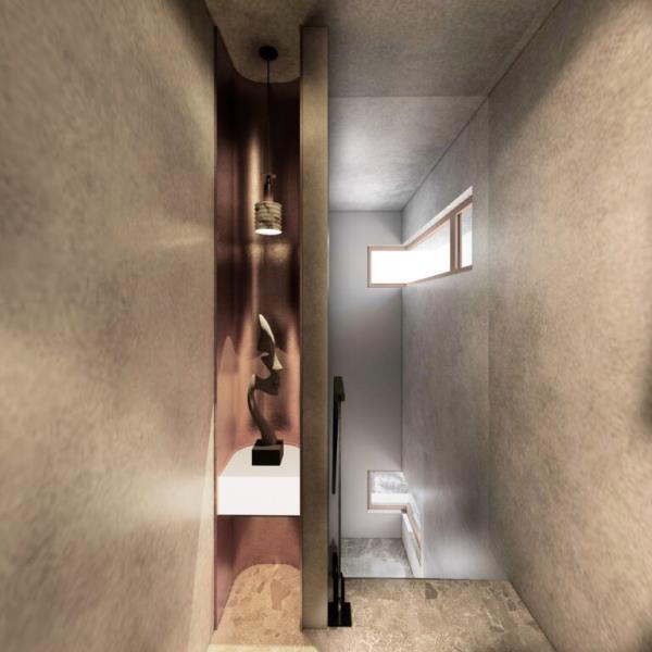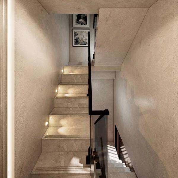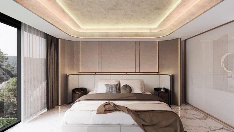 別墅的核心樓梯間設計獨具匠心,設計師捨棄了傳統的金屬或木質扶手,選用了玻璃材質,讓整個樓梯區域更加通透。牆面內嵌式把手內置燈光,不僅增加美觀度,還確保了夜間使用的安全性。私密的臥房空間延續了公共區域的設計語言,柔和的圓弧線條中和了直線的俐落感,營造出溫馨而舒壓的視覺效果,讓居住者感受到深層的放鬆與歸屬感。