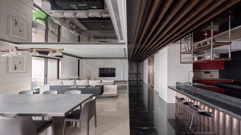 有別於常見的豪宅形式,本案特地摒棄過度裝飾的手法,以通透的格局、簡練的線條、材質與色彩的差異來組構空間,藉此營造出最純粹的生活場景。此外,設計師秉持著「設計是做來被使用的,而非只是表現美學型態」的理念,巧妙地將實用的機能設施與美感相結合,讓空間結構與使用性合理化,而不僅僅是因藝術而催化的。