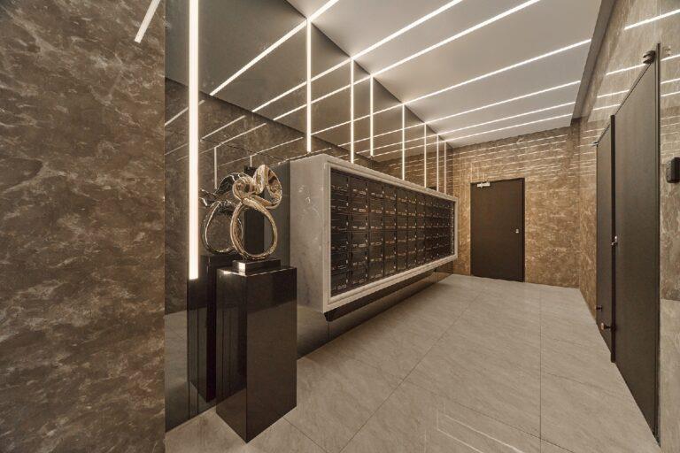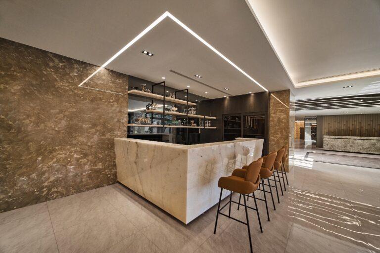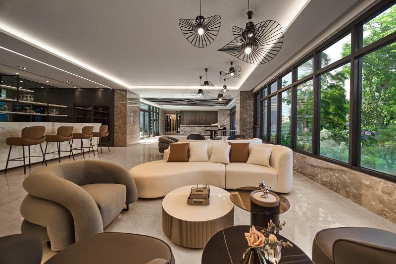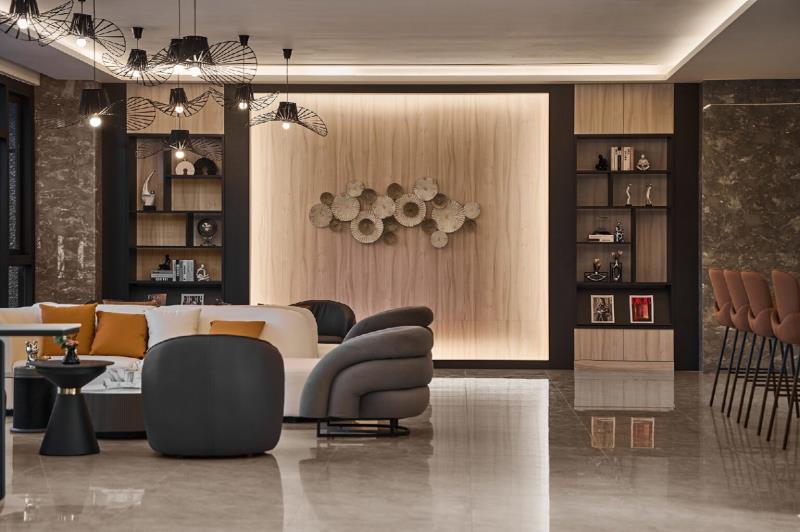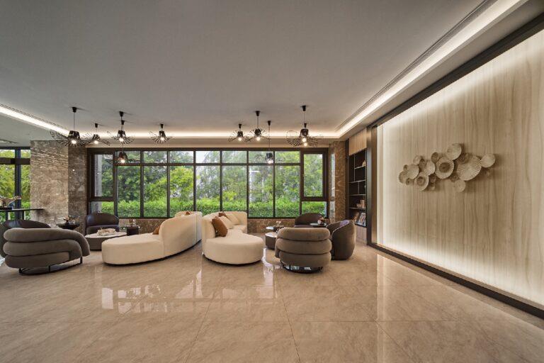 走進迎賓大廳,線性元素從此蔓延,包括天花板的燈飾、接待櫃檯的背牆與地板等,處處引導著住戶的入室動線。來到大廳一側的沙發區和吧台區,團隊以不同色階的大地色系作為傢俱和空間的主色,搭配不同形式的照明規劃與燈具造型,能使整體呈現溫暖、和諧調性的同時,又蘊含豐富層次。其中,沙發區的Cap Sky Chandelier和吧台區的線性鋁條燈悄然延續了線性元素。另外,吧台區背牆特別採用了黑鏡設計,其能使落座於此的住戶即便背對著窗,也依然能清楚望見窗外綠景。