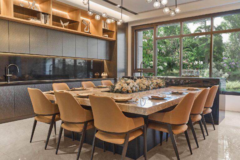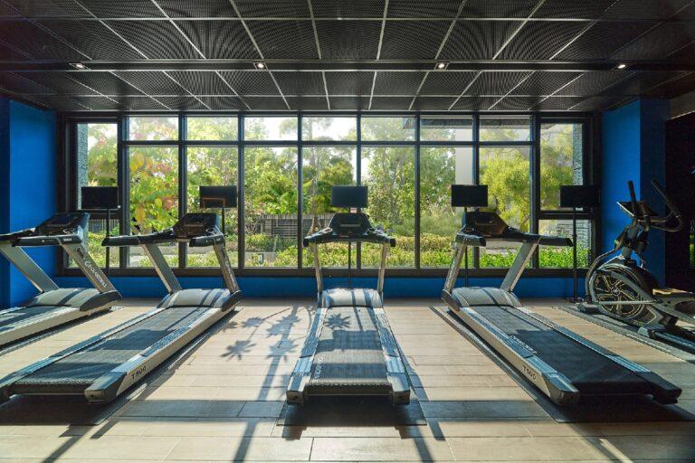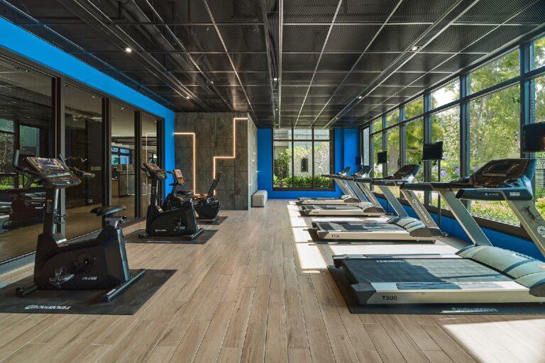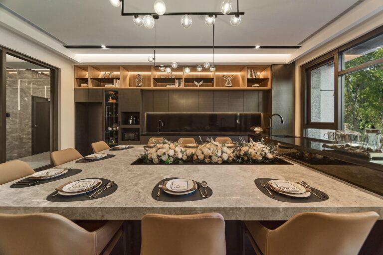 通往至多功能室,其配有桌檯、廚具及收納櫃,可作為餐廚空間或會議室之用,因應住戶多變的使用需求。除了配置完善的機能設施之外,團隊在場景塑造上亦有精心安排,包括導入質感雅緻的大理石桌、皮革椅、系統櫃、中島、花盆擺飾和吊燈等。藉此,形塑出美觀與實用性兼具的生活場景,為住戶提供極致舒適、高規格的居住體驗,打破公設空間冷清、無人使用的既定印象,並成為住戶與親朋好友聚會、聯繫情感的優質場所。緩步移動到健身房,為彰顯該場域的朝氣活力,團隊特意選用高彩度的藍色油漆粉刷牆面。同時,搭配些許灰色調的清水模板、傢俱與健身器材,平衡空間色彩比重,讓整體畫面協調又亮眼。其中,清水模板之間有局部鑲嵌燈條,既能呼應線性元素的應用,又能增添視覺層次。