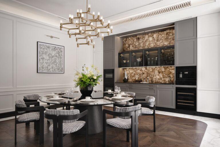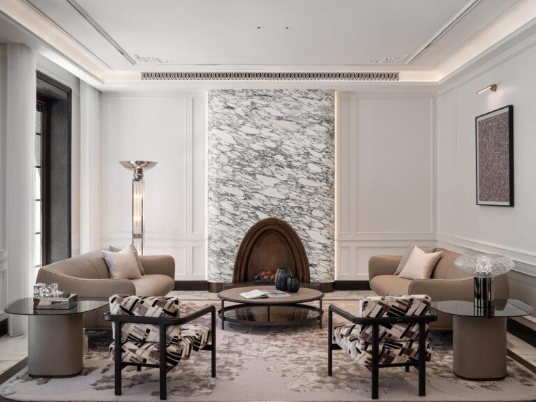 本案榮獲 2025 美國un設計大獎 un Design Award – 銀獎。本案位於上海核心地段,延續石庫門百年歷史與海派風華。團隊以融合與延續為題,保留中西交融的文化風貌,使傳統於現代藝術中綻放新姿。玄關以拱形結構引導動線,魚肚白大理石立面及黑白拼花地坪相互映襯,結合天花抽槽描繪出色彩層序,構築優雅的迎賓節奏與歸途儀式。懸挑樓梯下,水滴吊燈傾瀉柔光,光色相依和鳴,將生活幻化一曲浪漫樂章。