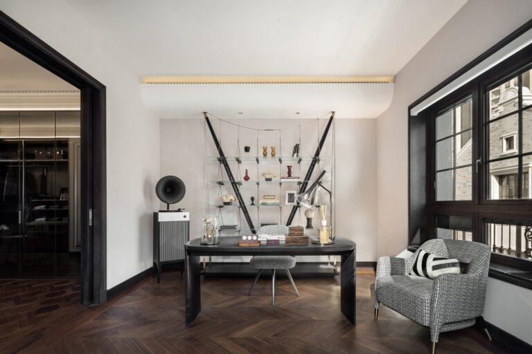 設計以旋律與藝術為構想,將日常轉化成空間曲調。客餐廳延續整體調性,以法式米白線板勾勒立面,結合凡爾賽木拼花地坪與石材肌理,營造古典與現代交融的場域韻律。起居室懸掛原創作品,運用藝術裝置串聯時光記憶,使空間成為情感延伸。臥室則採新法國海派風格,柔化空間色調和比例,於光影轉折間流露溫婉與詩意。