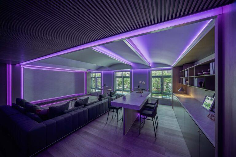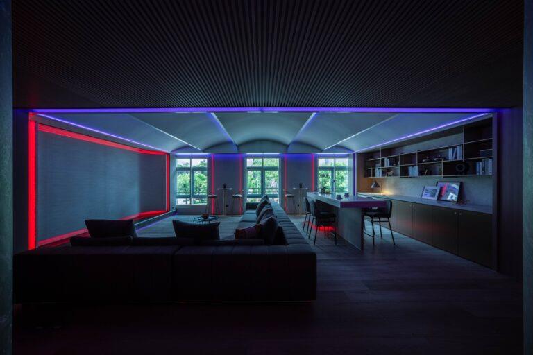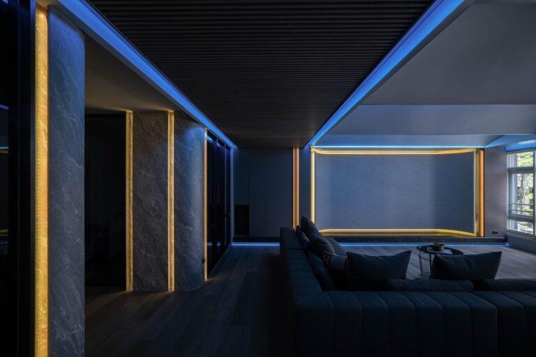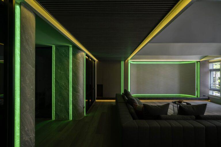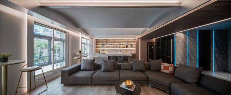 一進到室內,映入眼簾的即是大面積窗景,可引進自然光線、延伸視野。其中,全室配有RGB內嵌式燈條,能依循使用者需求靈活調整光源色彩,創造多變的情境氛圍。而天花板則有導入層層鋪展開來的拱形設計,可為空間增添律動與視覺層次,並消弭樑體的存在感。另外,為滿足日常交流、接待、休憩等多元商務需求,整體是採開放式設計,藉由整合沙發區與吧台區,能增加場域的使用效率和彈性。