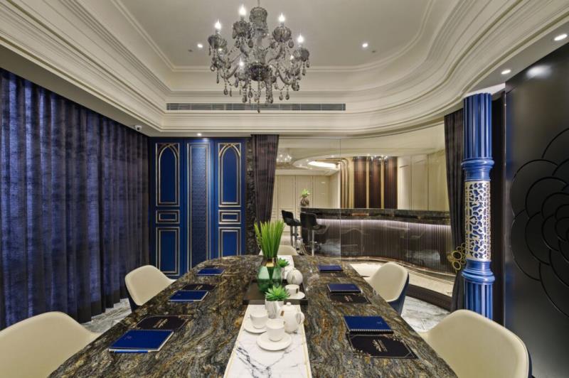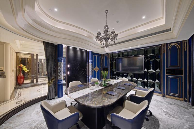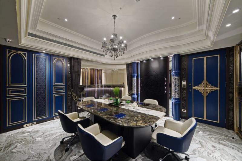 - 寶藍綻彩:深藍色壁面佐金飾勾勒細膩輪廓,營造沉穩典雅的議事語境。