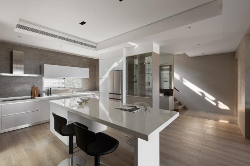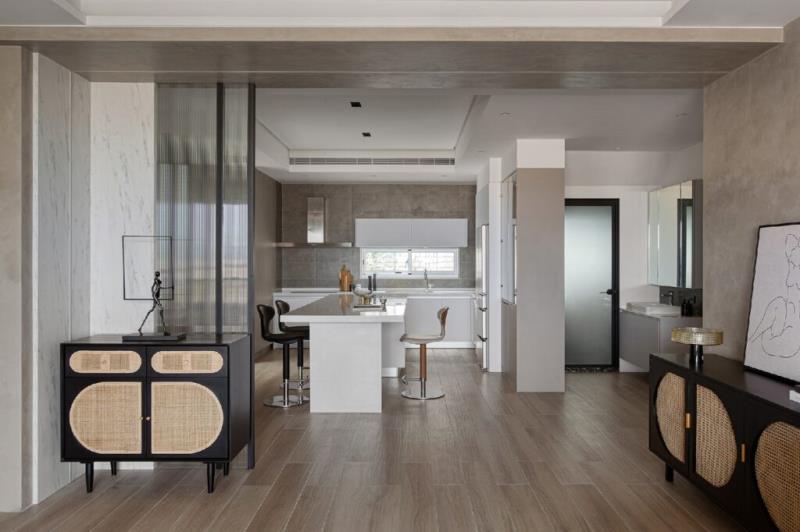 甫入室內,本案打破傳統制式化的格局劃分,公領域採用開放式的設計,不只創造寬敞明亮的空間,亦為居者帶來流暢的生活動線。整體場域沒有過多的裝飾,強調空間留白的呼吸感。而選用自然、溫暖的白色、灰色、米色、原木色等色調,在灑落室內的陽光下,呈現出充滿現代感的藝術氣息。客廳的電視牆與沙發背牆使用米灰色藝術漆,搭配溫潤的木地板,塑造柔和的質樸美感。餐廚區的牆面及平台選用易於清潔的材質,不僅舒適、美觀,還具備便利的功能性。