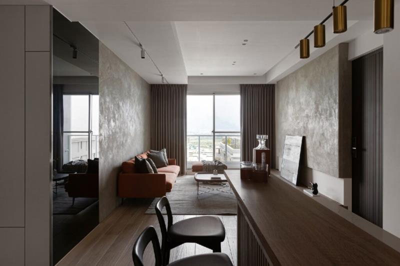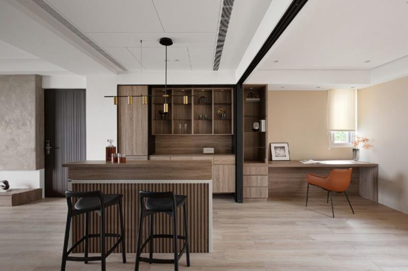 緩步走上樓梯,樓上的格局除了也規劃一間客廳外,還設有吧台用餐區,讓親朋好友來訪時提供舒適的聚會空間,能於此品酒、聊天共享美好時光,增進彼此的互動頻率與情感關係。臥室延續了公領域的樸實氛圍,以溫和、沈穩的色調與木紋鋪陳空間,讓居者得以享受愜意的休憩時光。