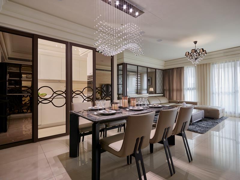 - 光影重奏:餐區燈具以層疊串珠描繪弧形律動,在現代造型中演譯古典美學。