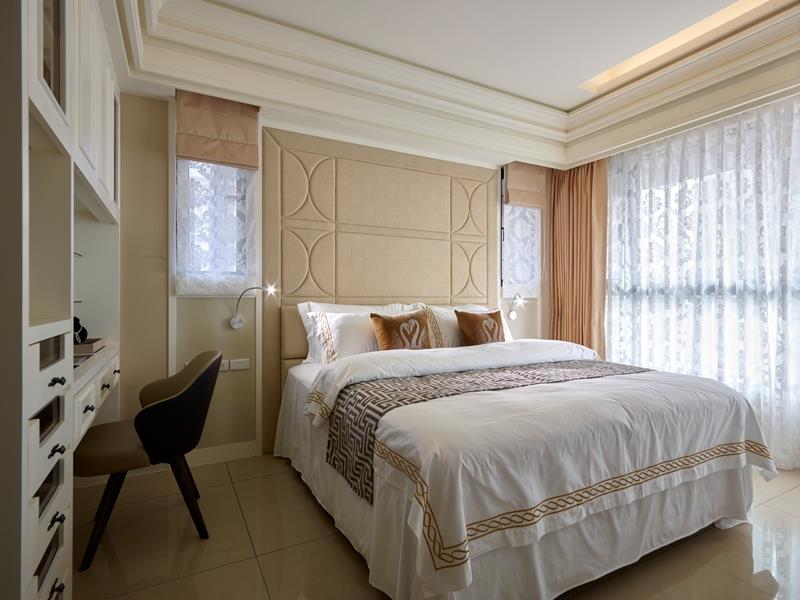 - 柔光主臥:繃布床頭搭配雙側窗引入柔和自然光,使休憩空間明亮而不失靜謐。