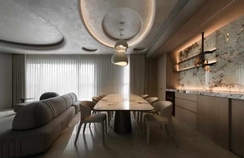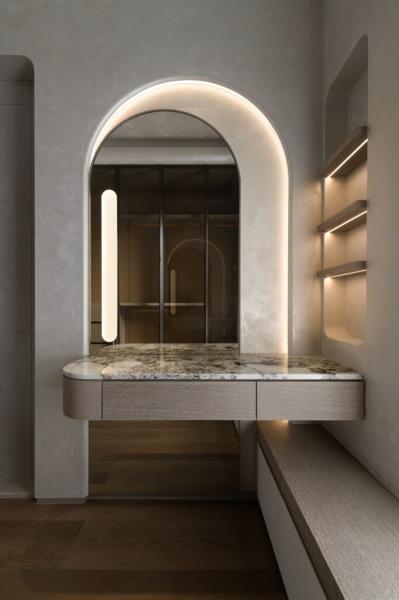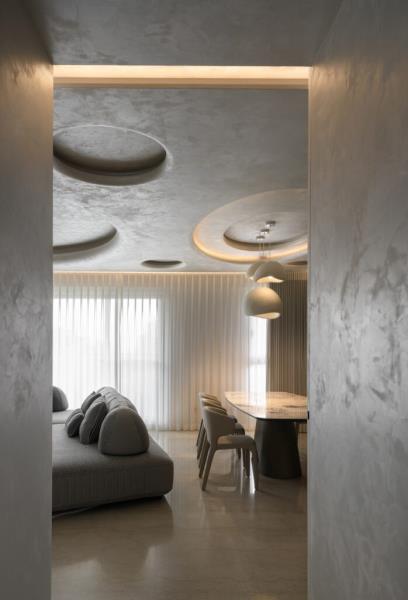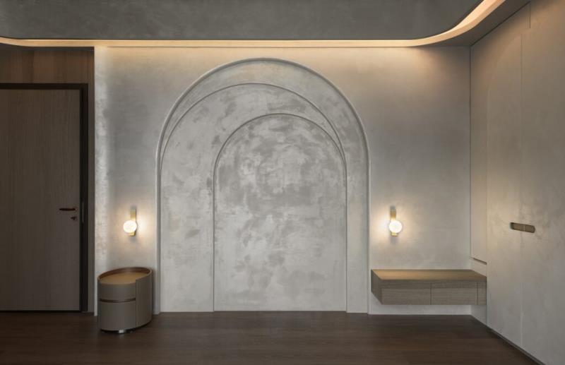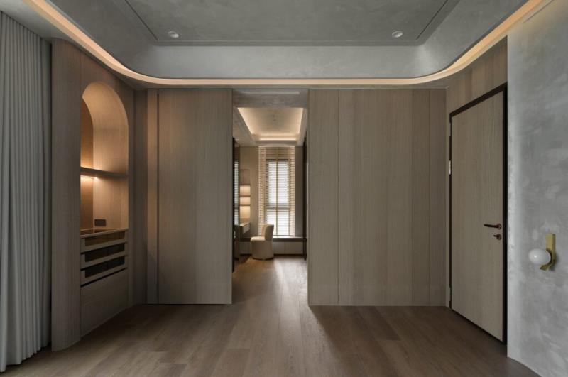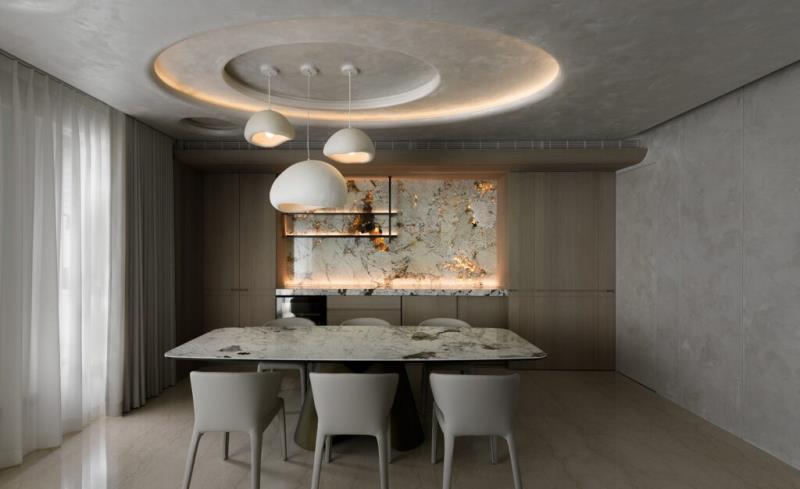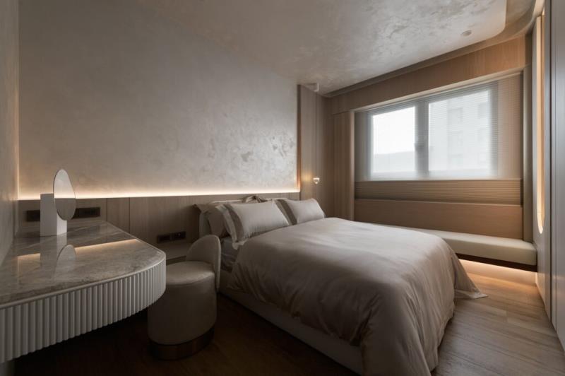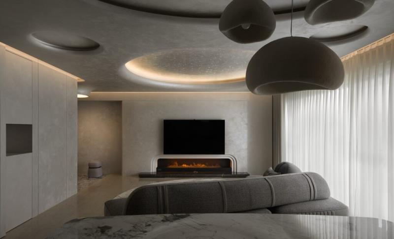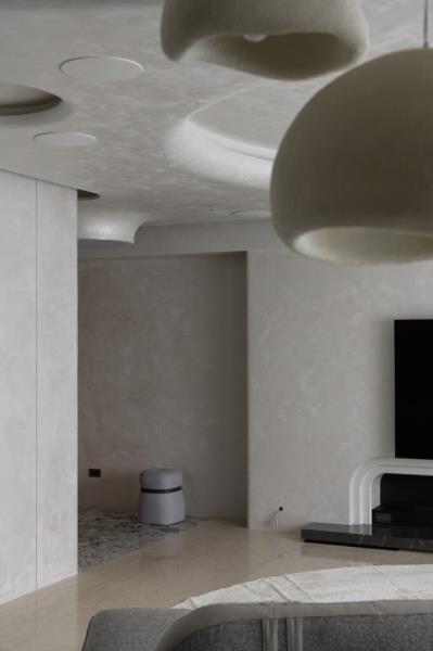 本案是以「月球」的形象作為設計主軸。透過圓弧元素、星空吊頂設計、灰色系藝術塗料與透光石材的應用,讓居者一到家便如同進入寂靜的月世界,藉此拋開繁雜的思緒與疲憊的身心。除了打造引人入勝的空間風貌,該案也十分注重美學與機能的結合,其中便包括採用弧形收邊設計來包覆空調機台。
