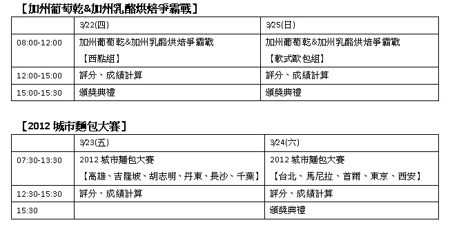 一、「比賽區」:今年的競賽包括3月22日「加州葡萄乾&加州乳酪烘焙爭霸戰」【西點組】烘焙達人賽及3月25日【軟式歐包組】烘焙達人賽令人期待外,首次由台灣主辦的國際競賽 - 「2012城市麵包大賽」也格外受人矚目,一連兩天(3月23日至24日)包括有來自日本、中國、韓國、菲律賓、馬來西亞、越南、台灣共計十一個城市代表隊伍參賽。比賽區另一個重頭戲,將是在烘焙展第二天(3月23日)由台北市糕餅商業同業公會頒發榮譽獎座給甫於2012年世界麵包大賽勇奪第三的台灣代表隊黃威勳、張泰謙及林坤緯三位師傅;比賽區戰況精采激烈,千萬不要錯過!